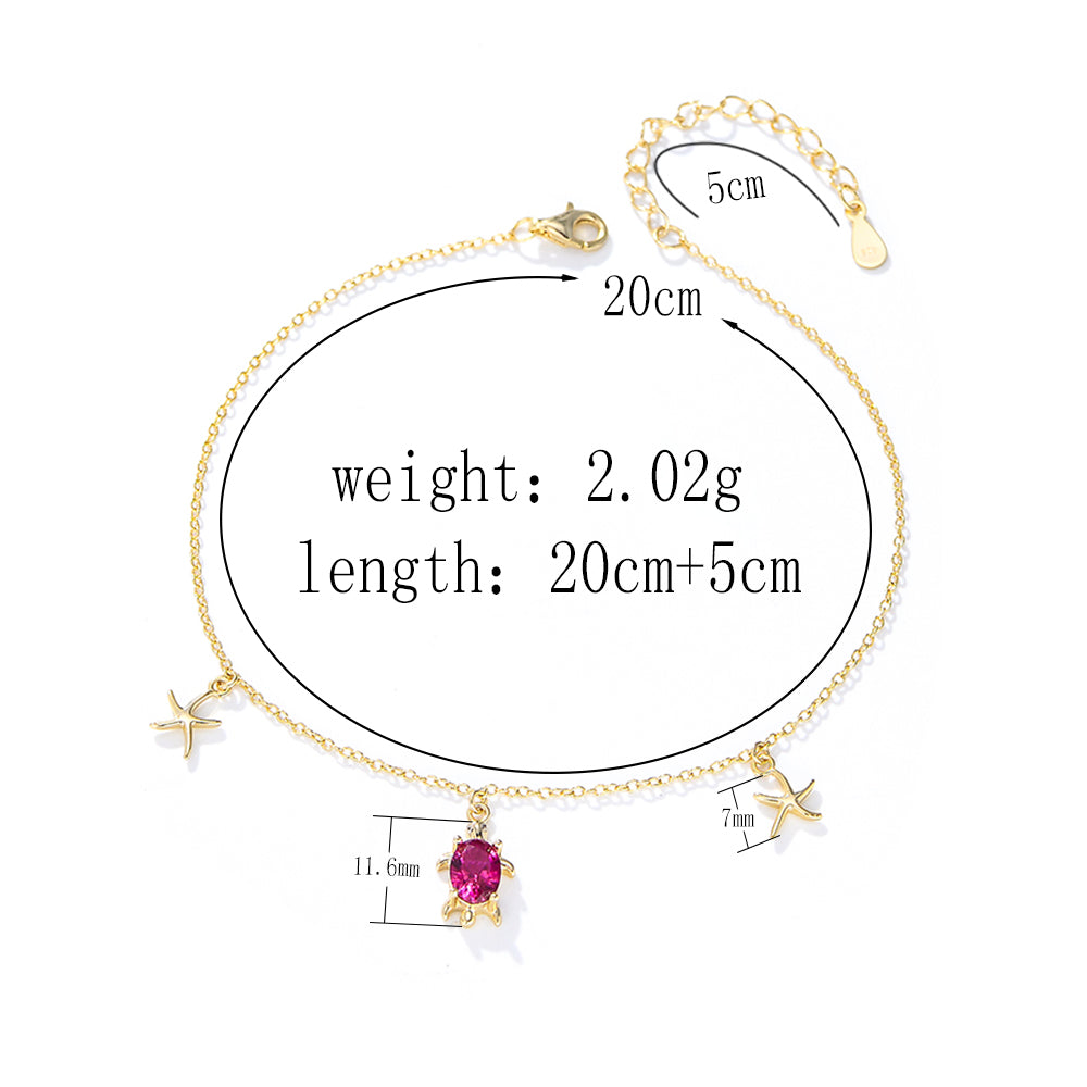 This 925 sterling silver anklet features a main stone of red corundum and sparkling white Zircon side stones. Its delicate design includes charming turtle and star shapes, expertly crafted with inlay technique. Weighing only 2.03 g, this anklet is stylishly lightweight. Elevate your summer look with this cute and beachy accessory!