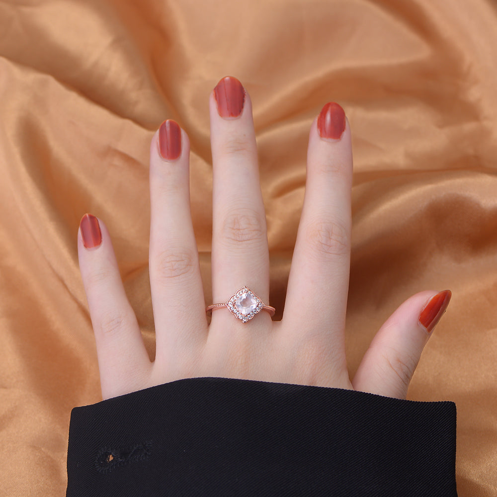 Rose Gold Plated CZ Natural Rose Quartz Gemstone Wedding Engagement Ring Jewelry