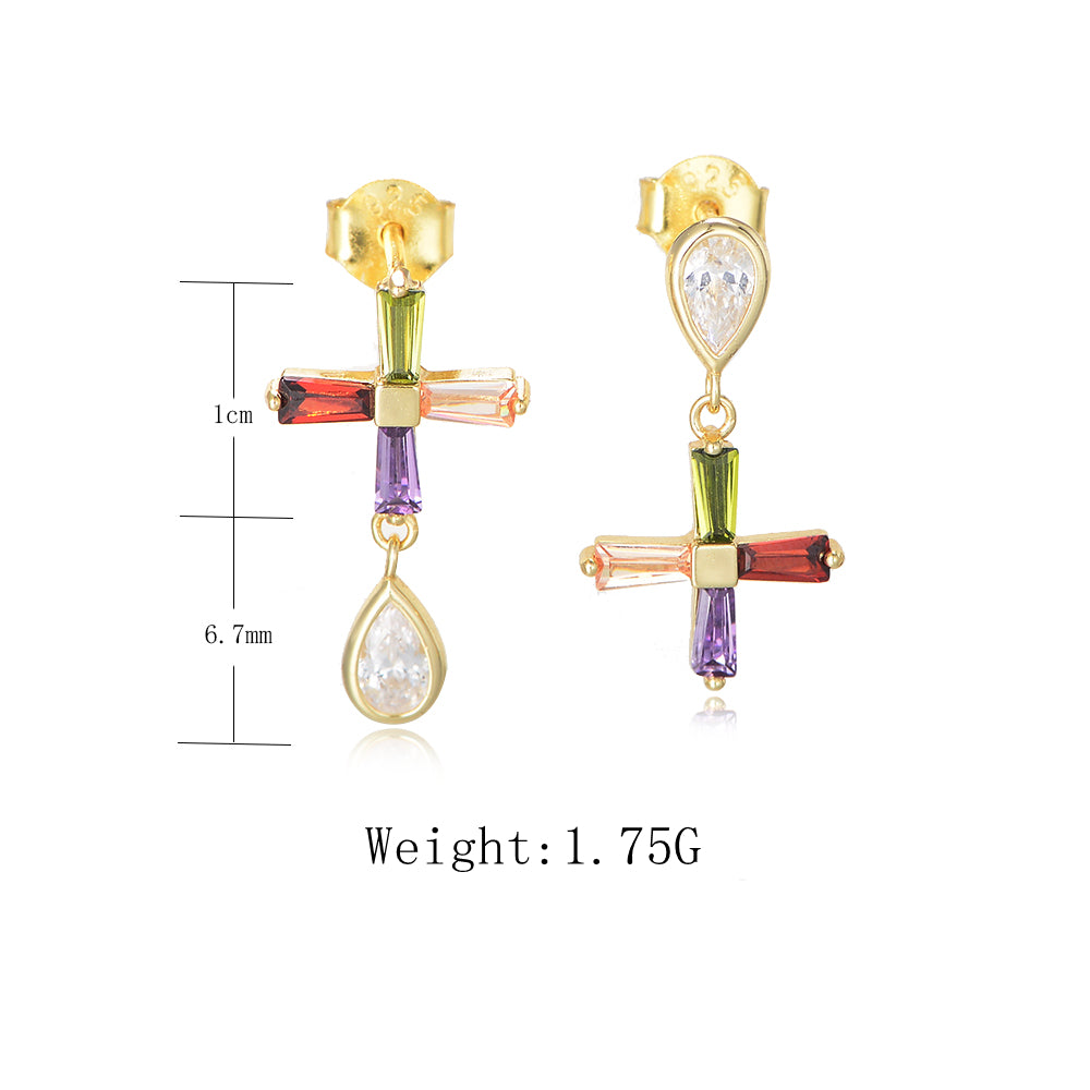 Elevate your style with these stunning Fine Jewelry S925 Silver Gold Plated Colorful Zircon CZ Diamond Cross Dangle Stud Earrings. Crafted with high-quality 925 sterling silver, adorned with white and multicolored Zircon stones, and expertly inlaid for a beautiful finish. Add a touch of elegance to any outfit and make a statement with the intricate cross and waterdrop design.