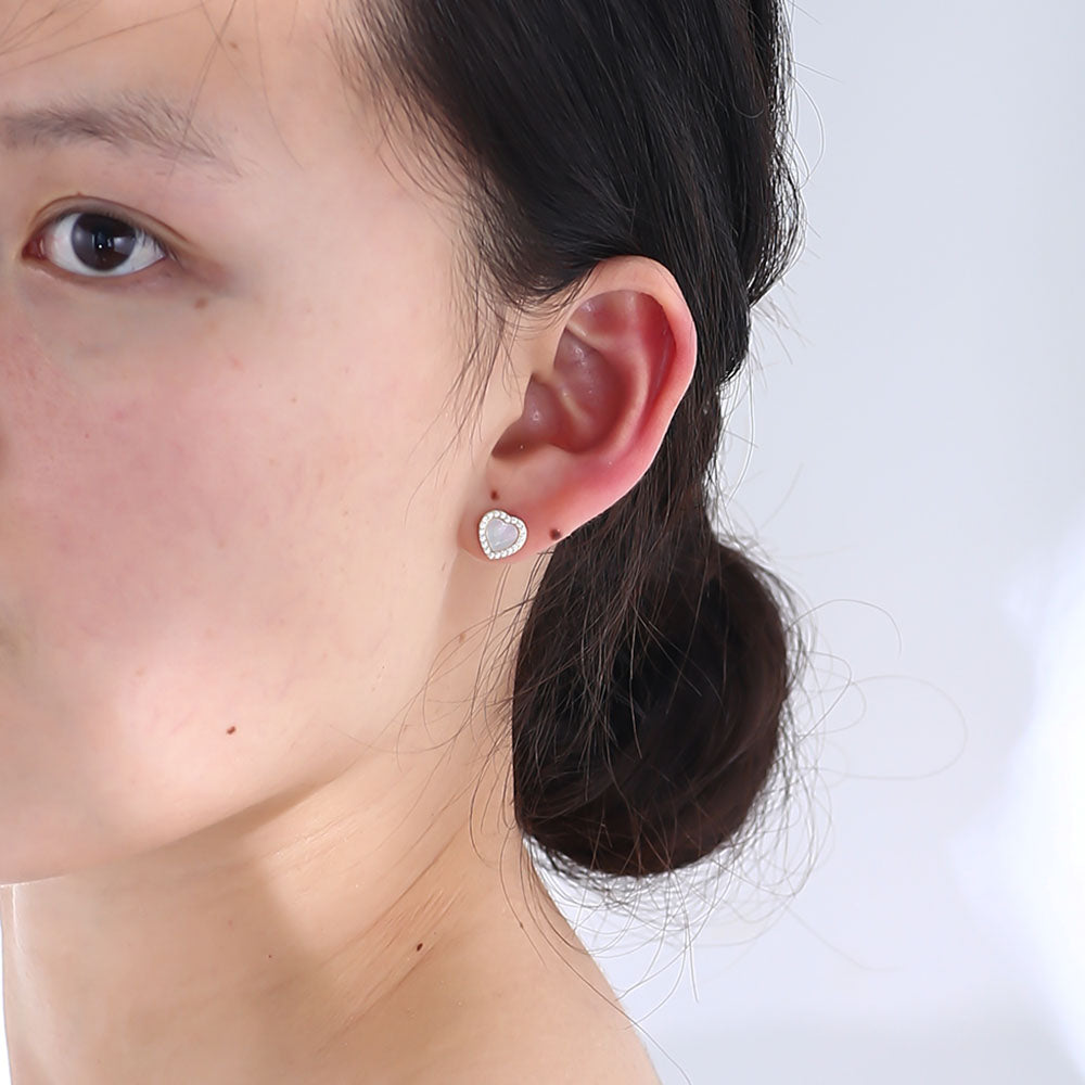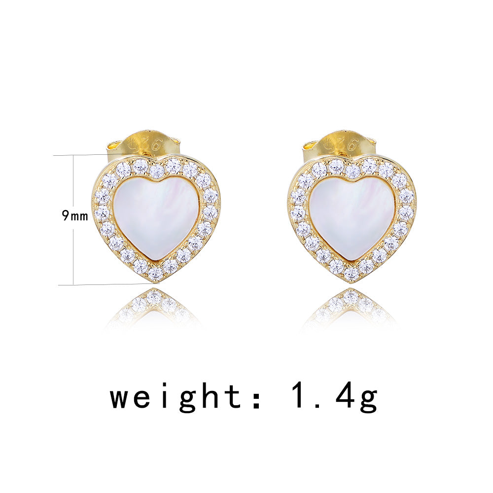 Indulge in the luxurious beauty of our 925 silver and 14K gold plated shell heart earrings. Adorned with a stunning shell pearl main stone and white zircon side stones, these earrings are expertly inlaid with a heart pattern. Delicate yet weighty at 1.4g, these earrings are truly a work of art.