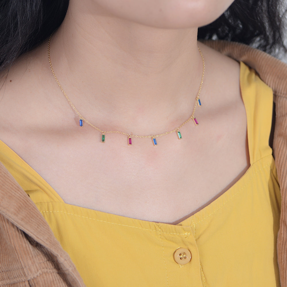 Rectangle Colorful Zircon Charm Choker Gold Plated 925 Sterling Silver Tassel Necklace